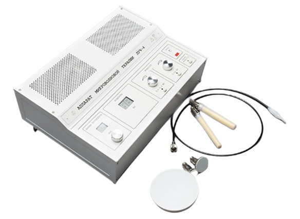 Аппарат СМВ-20-4 ЛУЧ-4 микроволновой терапии: используется в физиотерапевтических кабинетах лечебных учреждений для лечения электромагнитным полем гнойно-воспалительных заболеваний различной этиологии с помощью наружных излучателей диаметром 20, 35 и 110 мм; областью применения являются отоларингология, урология и гинекология благодаря наличию сразу трех внутриполостных излучателей ушного, ректального и вагинального соответственно. Особенности и преимущества: лечение при помощи щадящего воздействия малой мощности, которое не затрагивает окружающие здоровые ткани и органы, что особенно важно в педиатрии; сокращение сроков лечения заболевания в 2 — 2,5 раза по сравнению с применением медикаментозных средств или других физических методов лечения; автоматическое включение в режиме сброса мощности при подключении к сети; включение выходной мощности только при выведенному в крайнее левое положение регулятора мощности; автоматический сброс мощности по истечении времени процедуры с подачей звукового сигнала и световой сигнализации. подсветка кнопок управления, расположенных на горизонтальной панели. Технические характеристики: количество излучателей — 6 шт; частота электромагнитных колебаний, создаваемых аппаратом — 2,45 ГГц; два диапазона выходной мощности: 0…5 Вт — мощность регулируется десятью ступенями. — мощность на первой ступени не превышает 0,7 Вт; 0…20 Вт — мощность регулируется плавно — нижний предел не превышает 4 Вт; потребляемая мощность — 170 ВА; габаритные размеры — 400×360×160 мм; вес, — 12,5 кг.