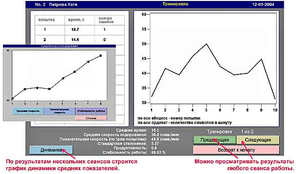 Результаты тестирования / тренировки отображаются в табличном и графическом виде