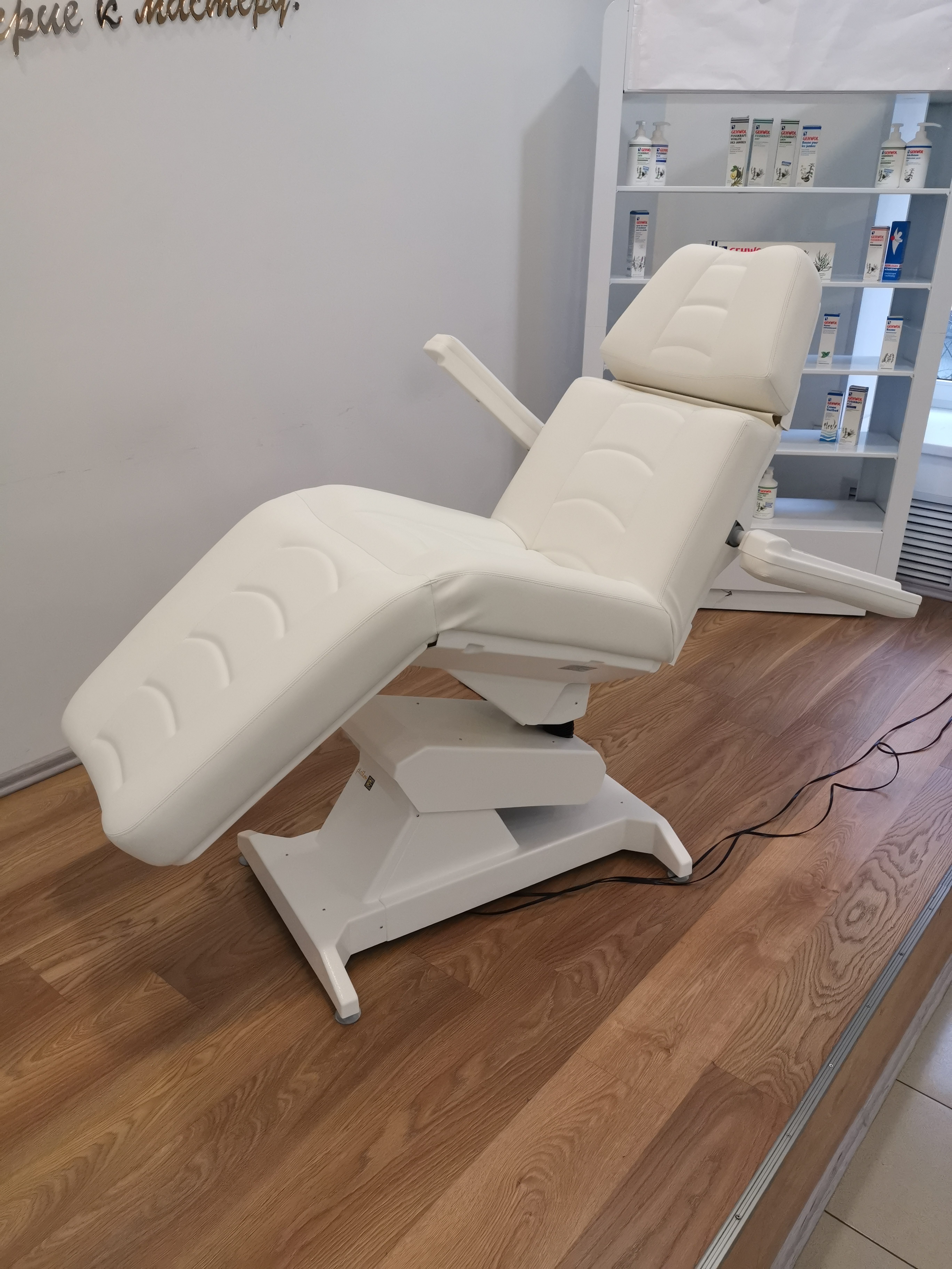 Кресло оснащено четырьмя надежными электроприводами, регулирующими высоту и спинку кресла, а также угол наклона сиденья и подножки.