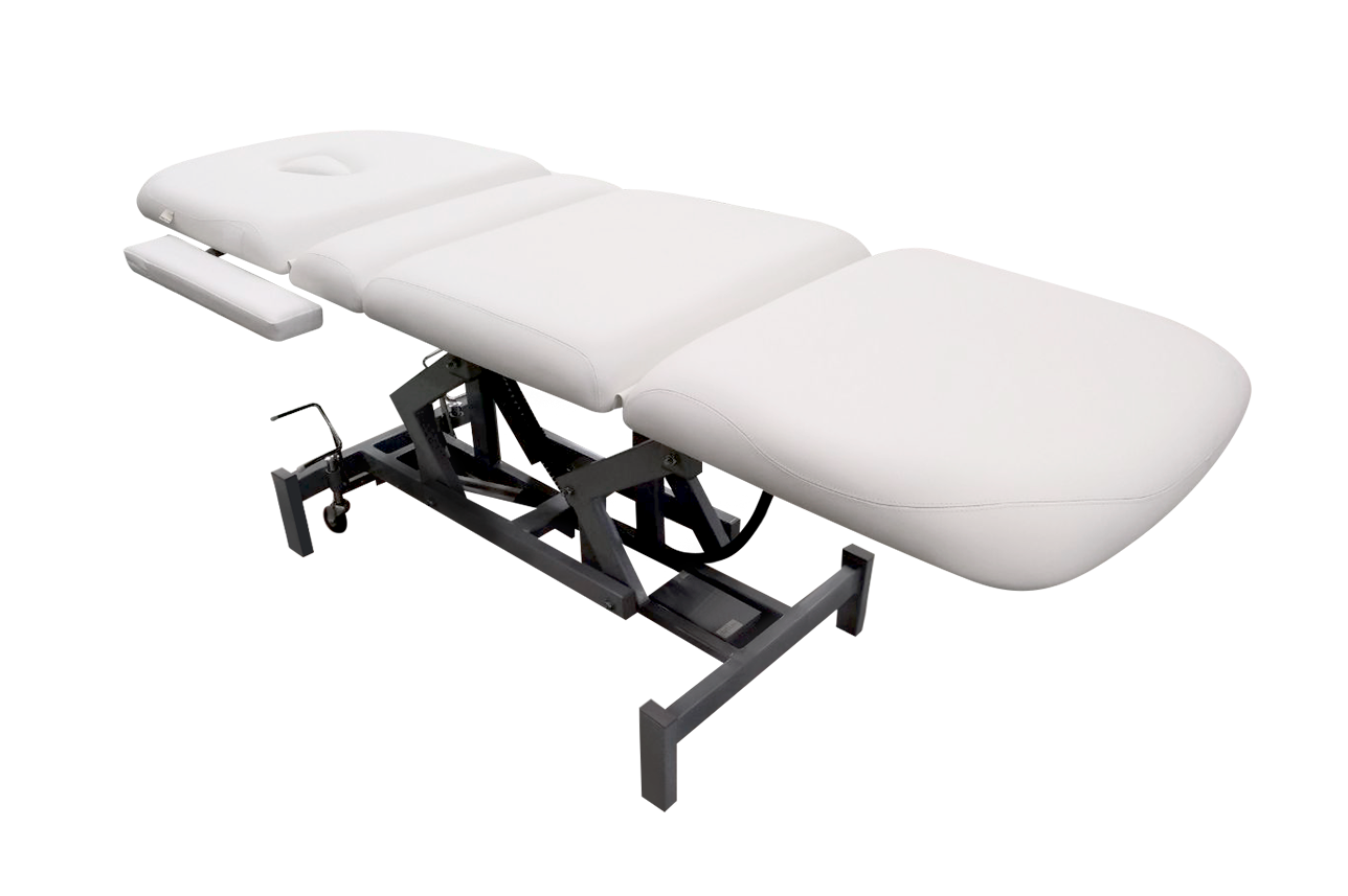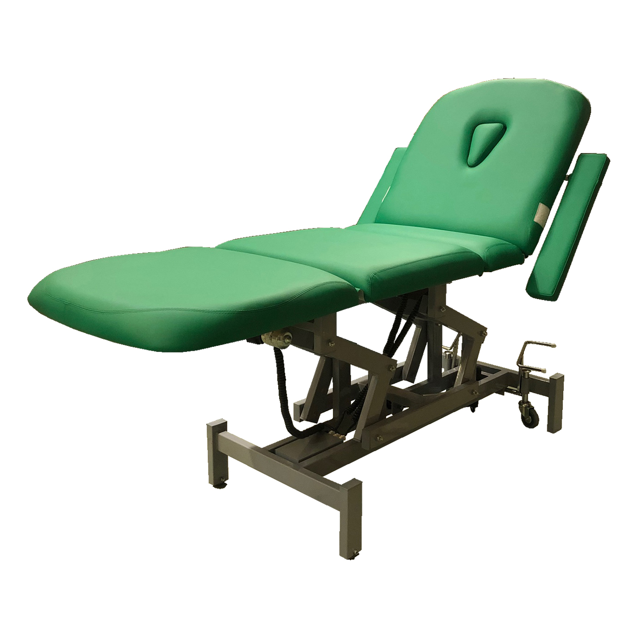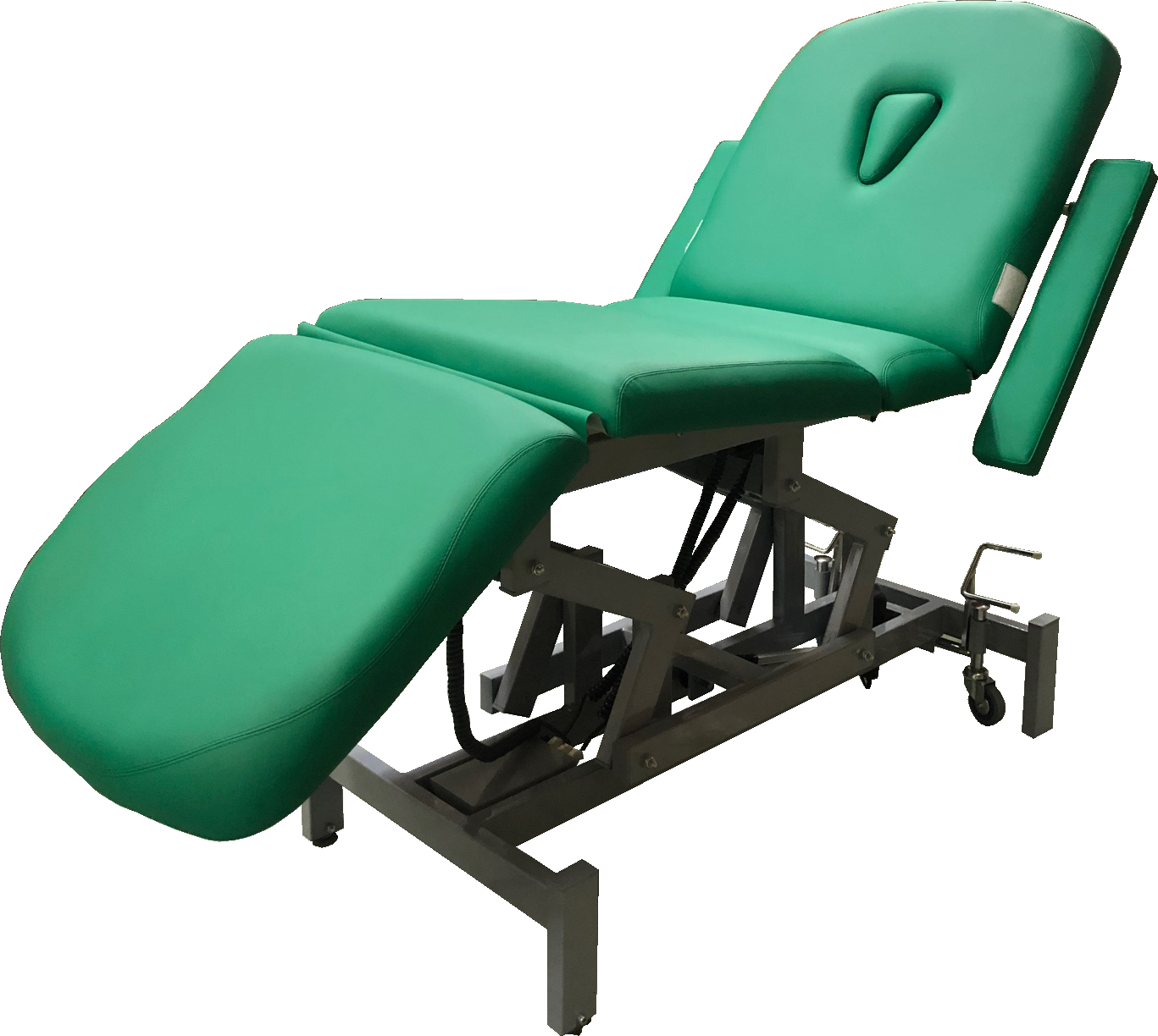 Кушетка оснащена четырьмя надежными электроприводами регулирующими высоту кушетки, угол наклона спинки и подножки, а также подколенную часть.
