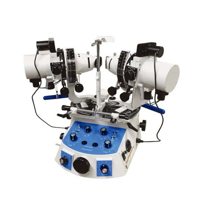 Синоптископы (синоптофоры) L-2510B предназначены для проверки, измерения, тренировки и улучшения бинокулярного зрения пациента (лечение косоглазия и амблиопии). Окуляры со встроенными зеркалами позволяют врачу обследовать роговицу глаза и синхронно проецировать слайды с различными изображениями во время диагностики и лечения. Синоптископ имеет лампу-вспышку с регулируемой частотой мерцания от 30 до 150 раз в минуту. Шестнадцать пар цветных слайдов с различными фигурами и пара слайдов для контрольного обследования.