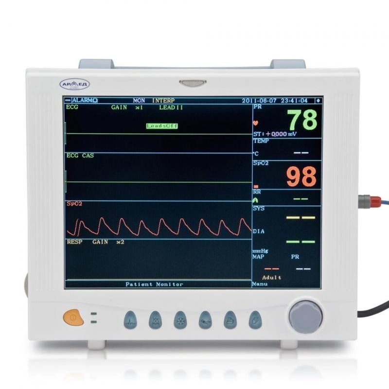 Многофункциональный прикроватный монитор "Armed" PС-9000f представляет собой портативный медицинский прибор для отслеживания жизненно важных физиологических показателей у пациентов. Этот монитор объединяет в себе 4 модуля измерений (ЭКГ, НИАД, SpO2, температура) и обладает рядом неоспоримых достоинств: компактность (малые габариты и вес) мобильность (два вида источника питания: источник переменного тока АС и внутренние батареи-аккумуляторы) пластиковый корпус не подвергается коррозии и легко моется; удобен для переноса (предусмотрена ручка). Кроме этого, в зависимости от различных требований пользователя можно выбрать соответствующую конфигурацию параметров. Наличие встроенной аккумуляторной батареи дает возможность использования монитора в местах с отсутствием электрического источника питания. Монитор прикроватный "Armed" PС-9000f – это надежное, качественное, универсальное устройство, которое дает большие возможности для работы с пациентами. Он обеспечивает высокую информативность, тщательно отслеживает показатели здоровья, тем самым позволяя медицинскому персоналу вовремя и правильно оказывать помощь пациенту. Функции: Прост в эксплуатации; Всё управление на лицевой паннели (кнопочное переключение); Большой экран высокого разрешения; Отображет параметры в реальном времени; Одновременно отображет до 12 показателей основных параметров; Полноценный мониторинг ЭКГ с возможностью выбора различных отведений; Воспроизведение 5-минутной фиксации ЭКГ и сопутствующих данных; Память более чем на 400 событий и до 20 эпизодов аритмий; Звуковой сигнал пульса; Наличие аудиовизуальных тревог; Установка пороговых значений показателей для срабатывания сигнализации; Прибор устойчив к работе дефибриллятора и электрохирургического оборудования; Индикатор низкого заряда аккумулятора; Питание от встроенной аккумуляторной батареи или сети.