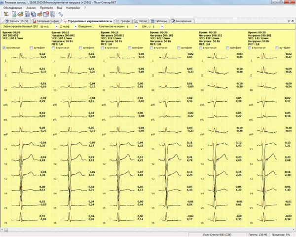 - в память компьютера сохраняется полная запись ЭКГ во время теста;
