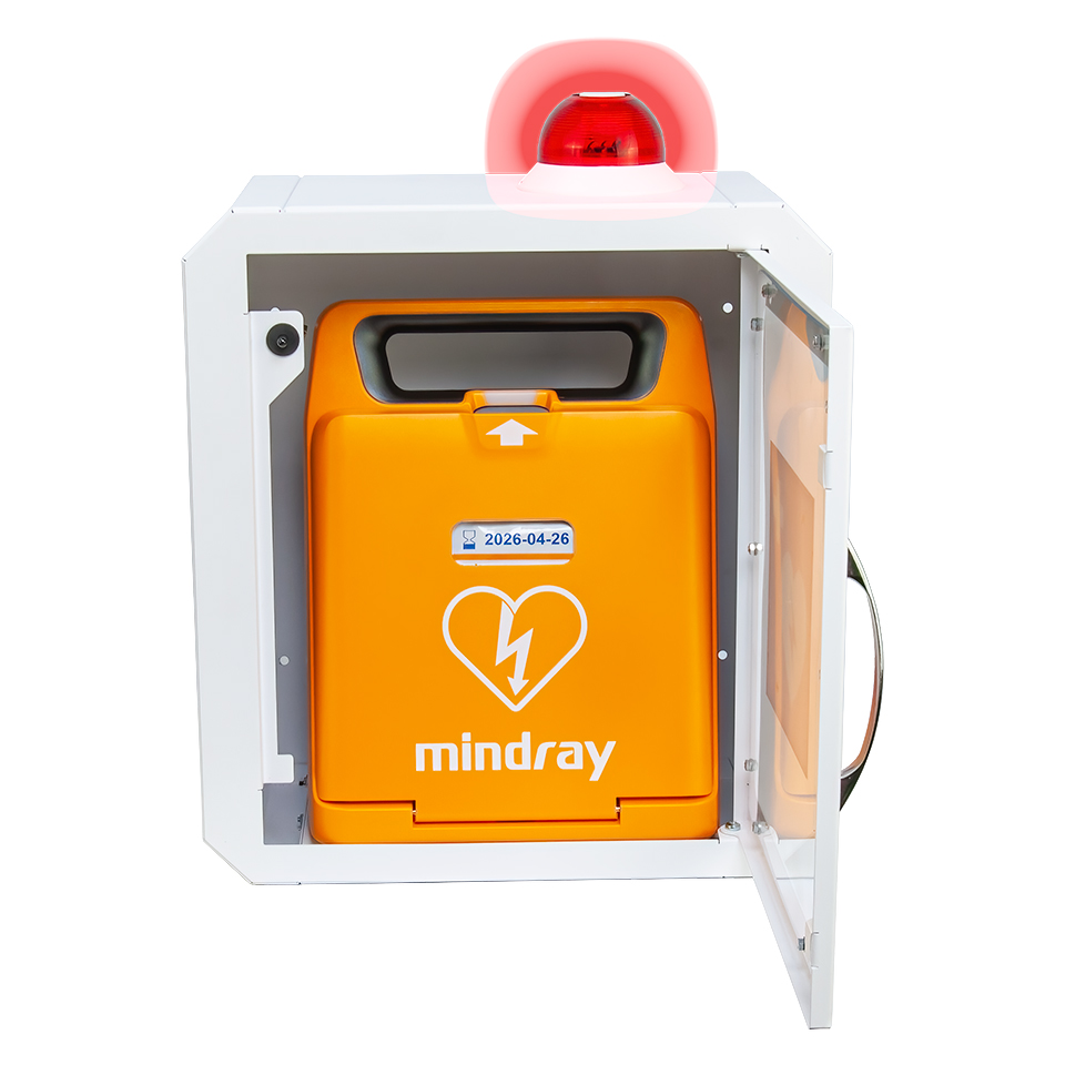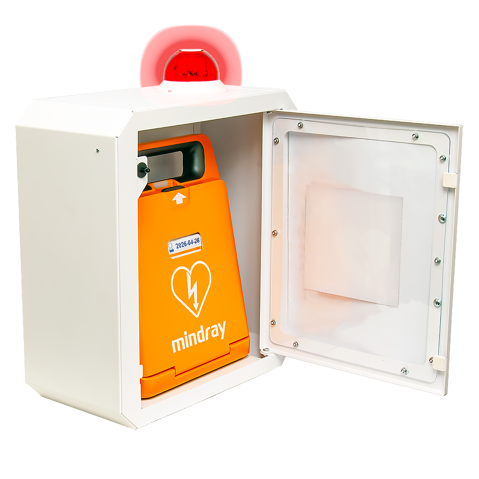 Есть открыть шкаф, то раздастся очень громкий звуковой сигнал (около 100 дБ) и загорится красная лампочка на крышке. Это сделано для того, чтобы обратить внимание людей на то, что произошла чрезвычайная ситуация, а также для предотвращения возможной кражи дефибриллятора.