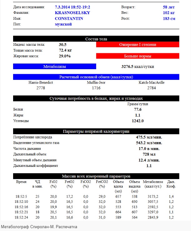 | Методика | Непрямая калориметрия |