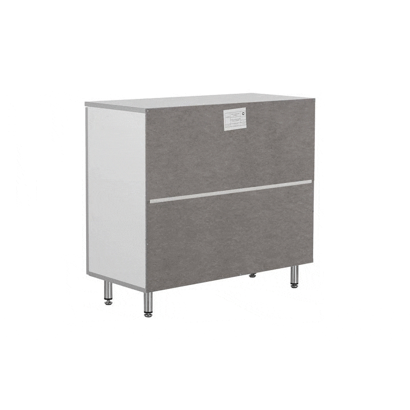 Тумба установлена на регулируемые по высоте хромированные опоры, глянцевая поверхность которых устойчива к коррозии, позволяет легко производить уборку и дезинфекцию помещений